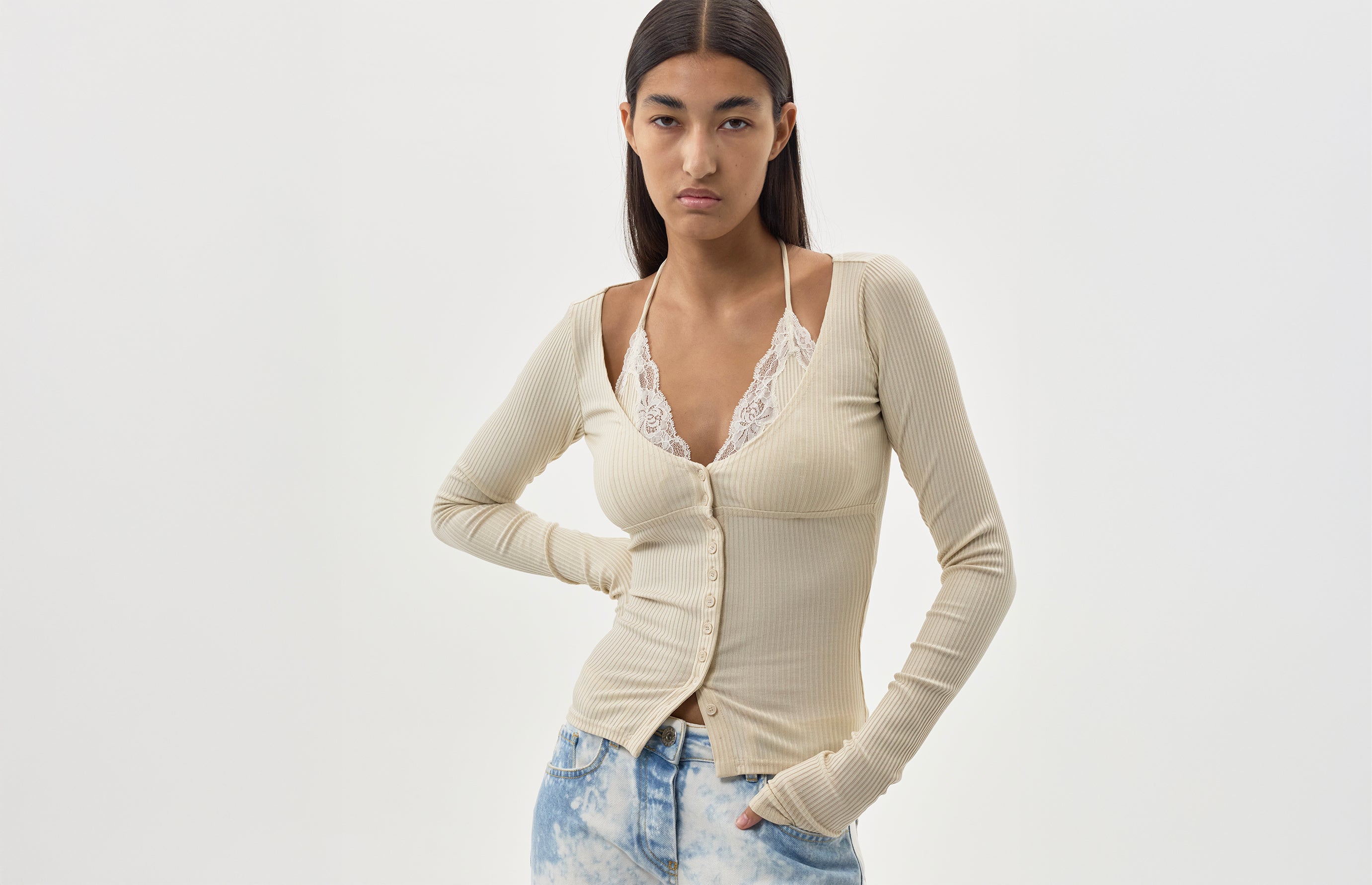 WASHED AND STAINED DENIM JEANS W/ LACE POLKA DOTS - PRE ORDER