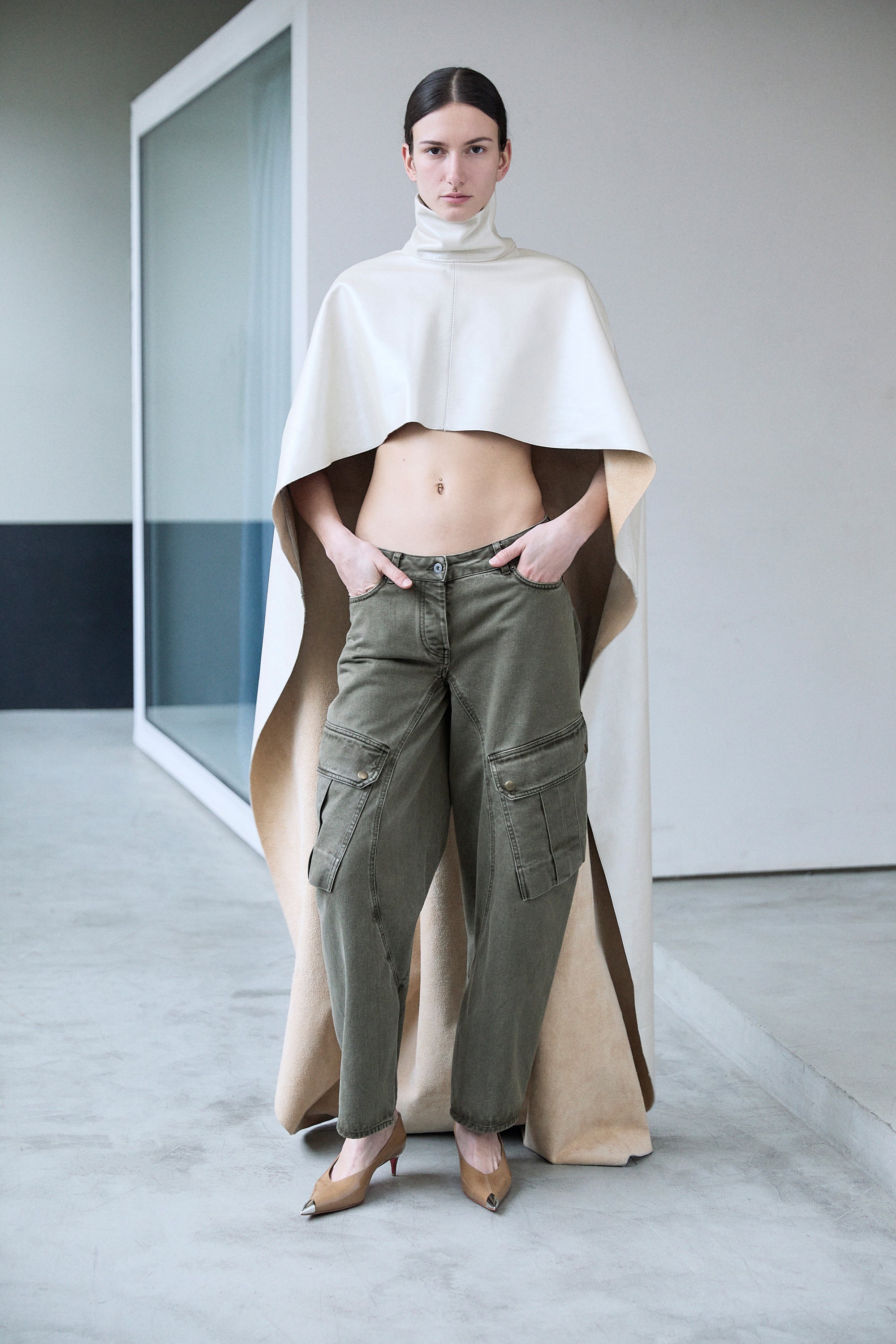 DENIM KHAKI PANTS WITH BALLOON CUT LEGS AND CARGO DETAILS -